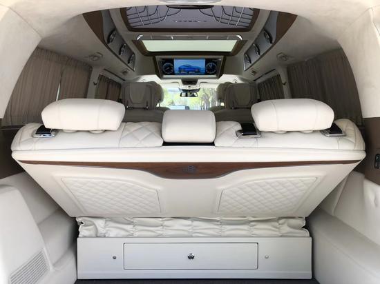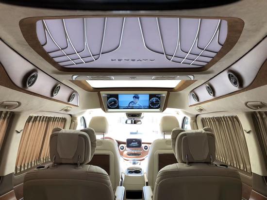 奔驰V260L改装商务车第二排航空座椅为带电动、加热、按摩、通风功能的航空级首长席,可沿着地面上滑轨实现一键电动式前后滑动,对于这种智能化的乘坐体验,是原厂车型笨拙的手动拖拽模式所望尘莫及的。车内的氛围灯打开后,奔驰V260内舱变得灵活多变,气氛也可以根据主灯颜色变换而变化,主要的乘坐座椅配置的独立的按摩功能,通风加热,一体腿托,功能丰富,乘坐舒适,是商务接待用车的代步良品。