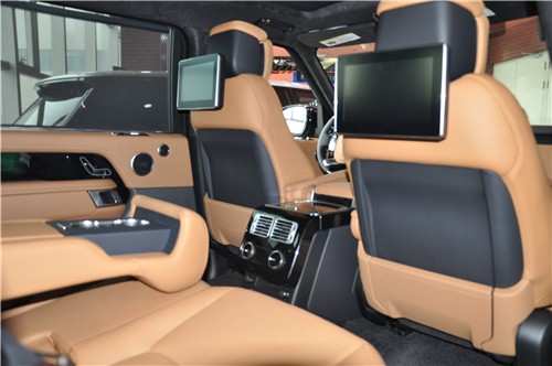20款路虎揽胜加长版在前排座椅的背部设置了安装iPAD的装置。后排还设有冰箱,不过冰箱空间非常有限。20款路虎揽胜加长版真正的奢华体验得要坐在后排座椅上才能体验得到,后座配有可移动式木制小桌子,方便用来当书桌或者电脑桌,平时不用时还可把它推到扶手处。