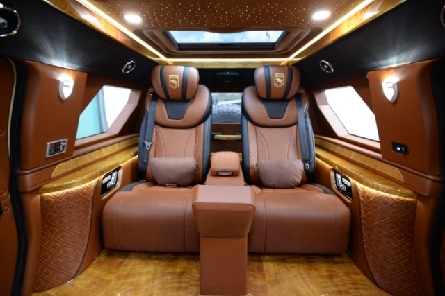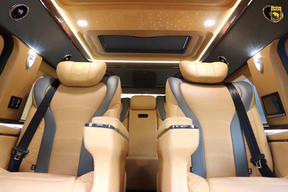 乔治巴顿打开后门进入后厢,这才是这辆车最重要的部分,低透光度的暗色玻璃在车外几乎看不到车内,你不配置也可谓是极尽奢华,第排独立的两个座椅舒适宽敞,完备的影音系统提供了非凡的视听感受。但是当您拉开车门,车内所展露的豪华设施定会为之而惊讶内饰,座椅纯手工缝制,看上去非常舒服,有着一种优雅古典的格调。