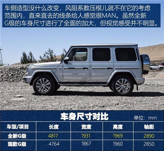 车身尺寸: 20款奔驰G500经过全新改款造相比老车型,全新奔驰G级 (配置|询价)车长增加53mm,宽度增加121mm,尺寸上的增加将会优化车内空间表现。涉水深度达到了700mm,比过往增加100mm。接近角31°,离去角30,双双增加1°,离地间隙增加6mm,达到241mm。
