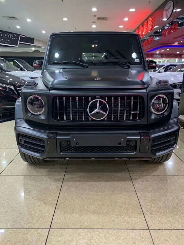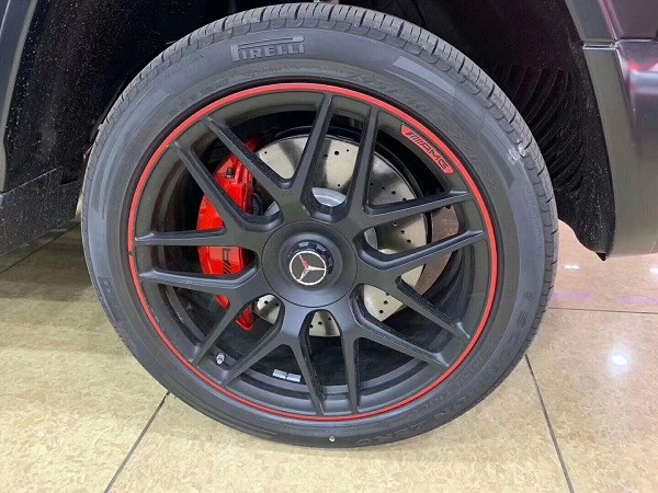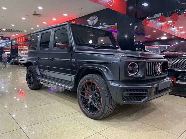新款奔驰G63 (配置|询价)拥有多色的外观选择,今天我们来看一看磨砂黑的G63!磨砂黑的颜色赋予了G63不一样的视觉冲击,好像它已经满副武装迫不及待的想冲进战场驰骋一番!全新的直瀑式进气格栅可以说是家族最新的设计风格,也是在新车外观造型上与奔驰系列产品差异化最明显的地方。其中AMG系列的直瀑式格栅在新时代下的鼻祖可以说是AMGGT车型,它内部由12根竖置镀铬饰条组成,同时新车的保险杠进气口相比G 500造型也更具有攻击性。此外,新AMG G63最大的轮圈尺寸提供22英寸可选,进一步提升了它外观造型的彪悍程度。展车不仅采用了全新的车身涂装,还搭配了红色的轮圈装饰,更加个性。