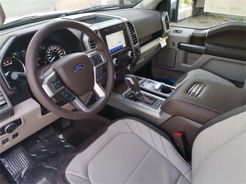 福特F150车内配备标准独特的皮革和布艺装饰的座椅,驾驶员侧的电动十向调节。这些座椅同时具备记忆功能。中央控制区搭配了触控式显示屏,其下方则是多媒体控制区及空调面板,采用旋钮+物理按键的组合。中控功能区域可分为三个小控制区,最上端为音响控制及导航控制,中间为收音机调节控制,最低端为空调及座椅加热控制。