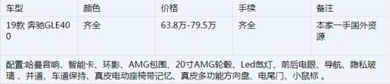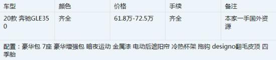 20款奔驰GLE450参数配置:发动机:3.0T 367马力L6,变速箱:9挡手自一体,排量(L):3.0,长*宽*高(mm):4935*1935*1796,轴距(mm):2995,最大拖挂重量(kg):3500,车身材质:钢铝混合,油箱容积(L):85,行李厢容积(L):630,最大行李箱容积(L):2055,进气形式:涡轮增压,气缸排列形式:L,气缸数(个):6,每缸气门数(个):4,最大马力(ps):367,最大功率(kw):270,最大功率转速(rpm):6100,最大扭矩(N·m):500,最大扭矩转速(rpm):4000,驱动方式:前置四驱,四驱形式:全是四驱,助力类型:电动助力,车体结构:承载式,轮胎规格:275/50R20。