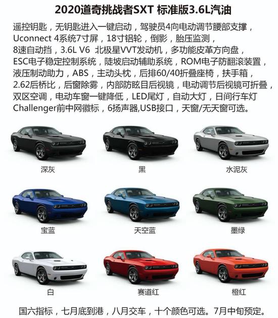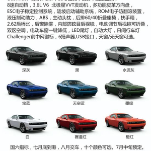 20款的挑战者将获得一台3。升的Pentastar V-发动机,它将应用在SXT,SXT AWD,GT和GTAWD级别的版本中。峰值输出功率为305马力,扭矩为28磅 - 英尺(约33牛米),城市燃油率为19英里/加仑,高速公路为30英里/小时。另外还有一款。2升Hemi V-8增压发动机。就算是最低配版本,也依然是搭载了3.L V引擎发动机,虽然这个版本原厂马力只有300匹左右,但经过改装,你依然可以享受到不错的动力和不同于四缸发动机的悦耳声浪。 本款车型搭载3。发动机,为SXTPlus高配版本,平行进口车型大多为标准版车型另外再加选配,本款车型选择配置较多,在外观上有18寸轮毂,LED光源等配置,外形更具科技感和运动感,配合复古的造型设计更为拉风。