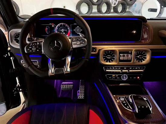 奔驰G 63 AMG (配置|询价)配备了大尺寸的前保险杠,配合全套车身动力学套件和大尺寸的AMG专属合金轮毂,使得G 63看起来极为霸气。同时,车身两侧镀铬双排气管也让奔驰G 63 AMG显得更加与众不同。G 63 AMG的内饰布局与普通版车型一致,只是变速杆的造型略有差异。G 63 AMG中控台多处均采用碳纤维材料覆盖。同时为了彰显其强劲的动力表现,G 63 AMG的仪表指针被喷涂为红色。