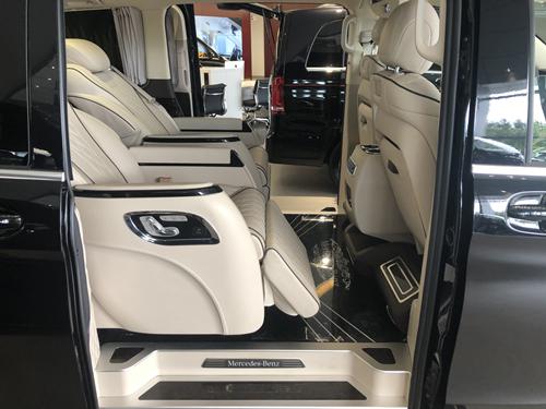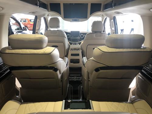 20款奔驰V260商务车乘客舱第二排多功能航空座椅,可旋转,并带有脚托功能,舒适乘坐,附有加热、通风、电动调节、按摩、记忆、电动头枕、电动靠背、电动肩部支撑等功能,座椅支持180度旋转。