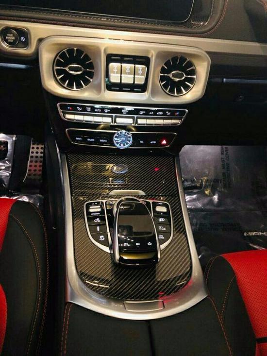 20款奔驰g63大量的碳纤维应用让整车内饰看起来时尚很多,标志性的硬性三把差速锁必须标配,独特的飞机螺旋式的出风口高档感不言而喻。