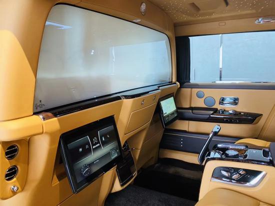劳斯莱斯全新幻影电动折叠板和后排影院系统被巧妙的隐藏在前排座椅的椅背后,只需轻触按钮,便可以自如收放桌板和影院系统,带来完美的剧院体验。后排中央固定扶手做了重点优化,其中国可容纳带有威士忌酒具的酒柜、香槟酒具和冷藏箱,方便乘客畅快交谈,后排座椅角度可以任意调节,这一设计让客户无需转头便可视线自如交流。
