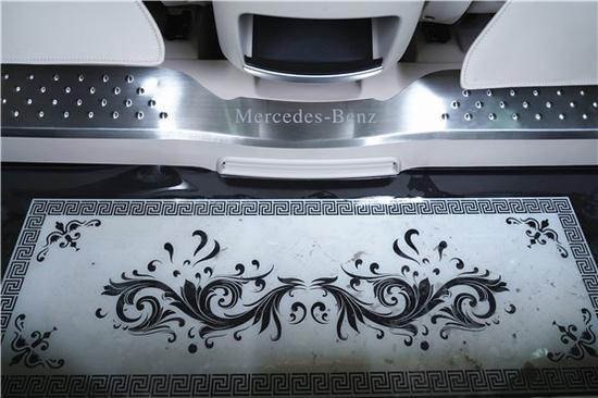 来到二排,门槛处带有梅赛德斯奔驰的字母标识,车内也是改装了迈巴赫地板,档次和辨识度都可圈可点,重点说一下定制版的迈巴赫航空座椅,皮质非常的细腻,座椅整个的包裹感和支撑感也都特别合适,坐在这里非常舒服,而且它还带有通风、加热、按摩功能,支持360度旋转,大家通过座椅上的这些按键就能调节,日常使用非常方便。