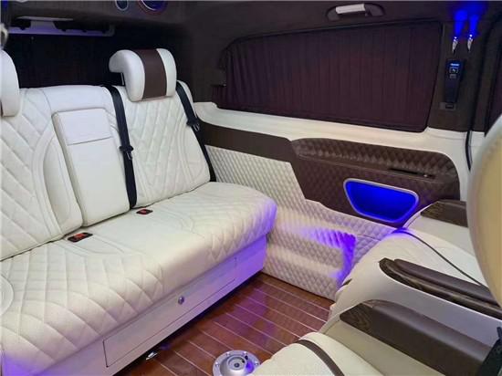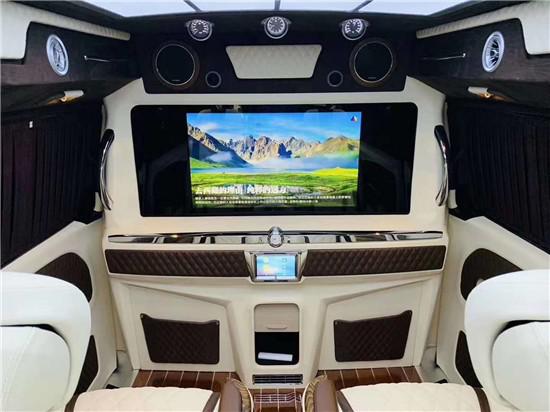 奔驰新威霆改装后还配有车厢内的灯光设备,按下按钮,车厢内顿时充满了黄色的炫彩灯光气氛以及漫天星晚上给人看星星的感觉。中控安装了14.1寸显示屏到时影响更加清晰可见还可以休闲娱乐,以及正副驾驶后面的商务桌板给了商务以休闲的功能,后面两个娱乐显示屏可让乘客更加休闲娱乐,商务人士可在会议过后利用车厢的灯光设备等,顿时让氛围轻松起来,可商务可休闲。吸顶电视设计使得车厢给人娱乐休闲的感觉,满天星顶会让您夜间行车抬头仰望,也让人有浪漫的星空臆想念头。倘若把周围的窗帘都拉开,闭上眼深呼吸,感觉与周围的环境很是融合,给人以心旷神怡的完美感