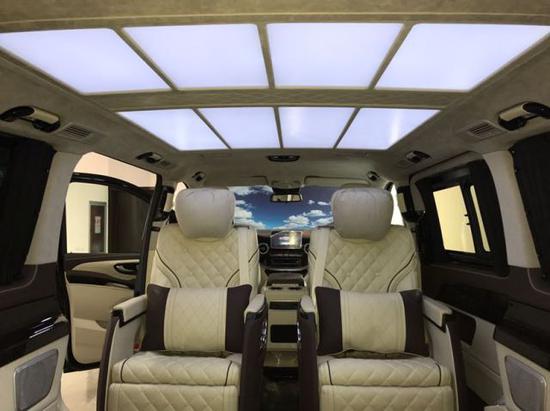 奔驰V250改装商务车房车价格内部装饰充满法国式的浪漫,九宫格灯珠镶嵌的椭圆形豪华顶棚造型设计气势磅礴,沿车身走向,两端与驾驶室隔屏和后门相衔接,形成古典对称的流线型图案。奔驰V250改装商务车全车新款电动精美布艺窗帘、控制车内电器的触摸屏操作,无不体现至尊豪华的商务形象,在与驾驶室全隔屏下,设置了多功能组合柜吧台,闲暇时与家人朋友来杯咖啡或是红酒,品味慢酌细语间的浪漫情怀。7座,家居、商用适合不过、Nespresso咖啡机,对车主的冷暖饮食需求关怀备至。