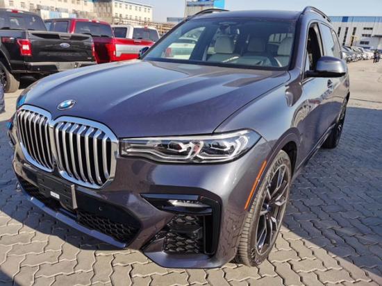 新款宝马X7外观方面,全新宝马X7不仅延续了宝马家族式的设计,也添加了不少全新的设计,车头宽大厚重,前脸标志性双肾型进气格栅做了加大处理,直瀑瀑型中网周围包裹宽大的饰条,不仅辨识度高攻击力也是非常强的,两侧连接大灯组,外观做了开眼角处理,上下两条LED日间行驶灯做了上下眼眉,两组大型的远光灯被箭头式造型勾勒,下面的进气口采用大嘴式设计嘴角连接L型雾灯区,有种嘴角上翘的而感觉,远远望去非常有威严。