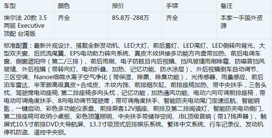 [车型]:丰田埃尔法蒙娜丽莎天鹅版[配置]:2.5发动机[备注]:现车,国六 详情如下表: