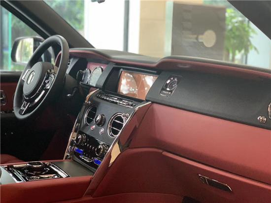 劳斯莱斯库里南内饰方面采用了劳斯莱斯家族式的设计,新车采用了经典的三联仪表盘,同时还将配有可收起的10.2英寸中控屏, 中控面板的边框由手工打磨的金属条包裹,不仅将上部的仪表板和中部的控制台连接起来,更通过容纳仪表板上的横向设计元素,增加了掌控感,中控屏右侧还装配有万国时钟。