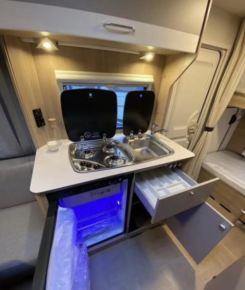 在470中特别实用:下层双层床可以折叠。然后通过侧壁上的一扇大门,将床箱用作车库,例如用于运输自行车。两种型号的内饰装饰,带金属铰链的两色调家具前板和塑料扣子均相同。同样,带有三个燃烧器的燃气灶具,水槽,95升内置冰箱和下方带有橱柜的餐具拉出式厨房块。
