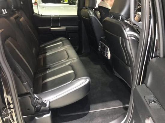 福特F150车内配备标准独特的皮革和布艺装饰的座椅,驾驶员侧的电动十向调节。这些座椅同时具备记忆功能。中央控制区搭配了触控式显示屏,其下方则是多媒体控制区及空调面板,采用旋钮+物理按键的组合。中控功能区域可分为三个小控制区,最上端为音响控制及导航控制,中间为收音机调节控制,最低端为空调及座椅加热控制。