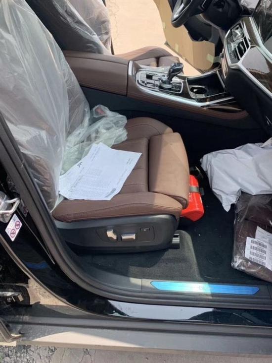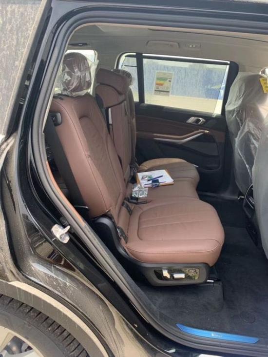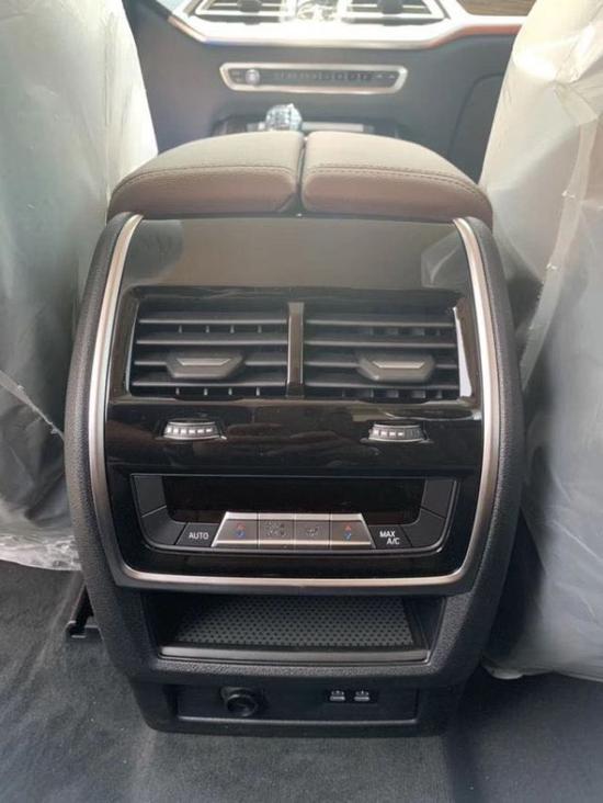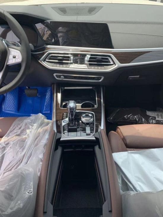 内饰部分,宝马X7采用最新家族式设计语言,使用大量真皮、木纹饰板进行包裹。配备12.3英寸带有注意力检测的全液晶仪表和12.3英寸悬浮式触控显示屏,空调出风口与温度显示屏、实体功能按键结合在同一区域,并使用银色装饰条进行点缀。