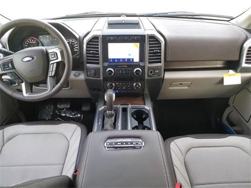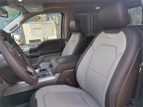 福特F150车内配备标准独特的皮革和布艺装饰的座椅,驾驶员侧的电动十向调节。这些座椅同时具备记忆功能。中央控制区搭配了触控式显示屏,其下方则是多媒体控制区及空调面板,采用旋钮+物理按键的组合。中控功能区域可分为三个小控制区,最上端为音响控制及导航控制,中间为收音机调节控制,最低端为空调及座椅加热控制。