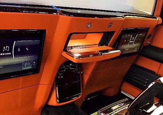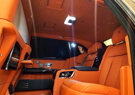 劳斯莱斯幻影加长版,4门4座版本 6.7T,V12,571匹马力,8速手自一体,双涡轮增压,长*宽*高5990*2018*1656,轴距3772,时下最流行的爱马仕橘色缝线搭配曜石黑内饰,绝无仅有的搭配。通过对铝的完美使用,庞大的车身控制在2745KG重,并采用全新的N74B68A双涡轮增压6.7T V12发动机,最大功率420KW,在1700转下就可以发挥最大扭矩900NM,与八速手自一体变速箱的的通力合作,使新幻影0-100Km/h的加速仅为5.4秒。