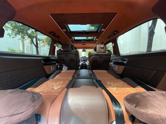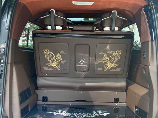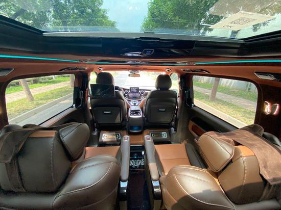 进口奔驰V250 7座商务车后舱前为两个独立航空座椅。中央的首长席座椅多功多样,包括多向电动调节、腿托、通风加热按摩,无线充电等。此款航空座椅经过国家3C认证并配备液晶智能触控调节屏幕,安全舒适。上面的缝线也相当细腻,首长席均配有可折叠桌板,后排除了正常容纳三名乘客非常宽松的乘坐之外,还能将其完全放平。