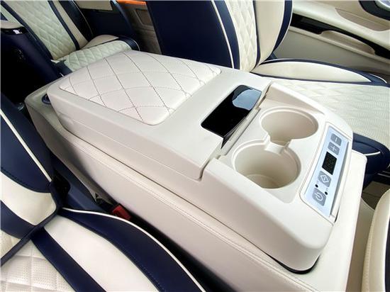车顶材质及主副驾驶座椅的材质也进行了重新的换装。中央扶手箱处被一台车载冰箱所取代,座椅及门板均采用了手工麂皮和nappa真皮拼色包裹。