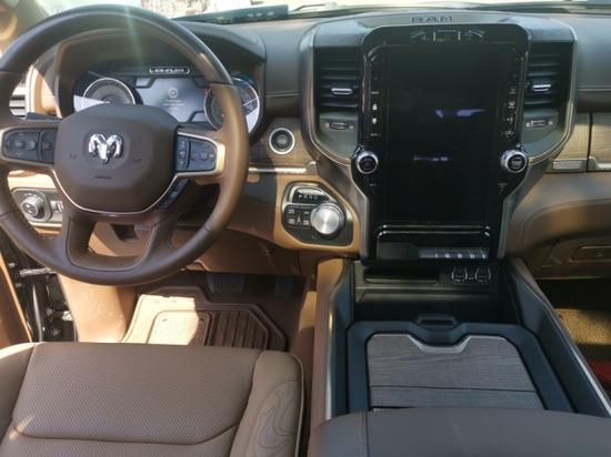 道奇公羊大角牛皮卡在内部设计上还是延续了美式那种比较粗犷的风格,规整的中控台设计看上去比较死板,但丰富的配置会让你不由得为其称赞。中控台的设计简洁硬派,符合公羊的气质。仪表盘底边有花纹,则更加凸显了这款车的文雅性。软性材质的仪表台设计,摸上去手感非常舒服,并无些许生硬之处。