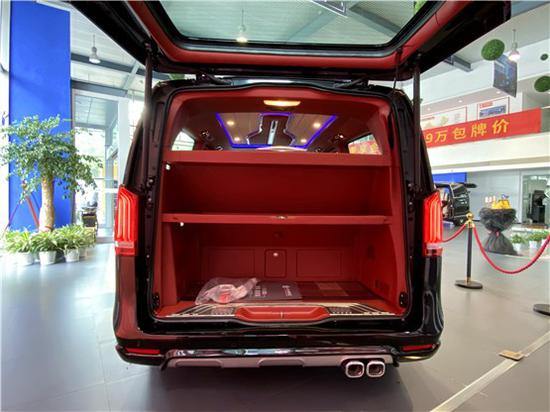 我们可以看到不管是车身色彩还是轮毂,这款奔驰V250都和原型车有了很大的不同,动感的红色拉花线条贯穿车辆全身。