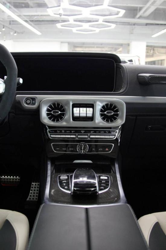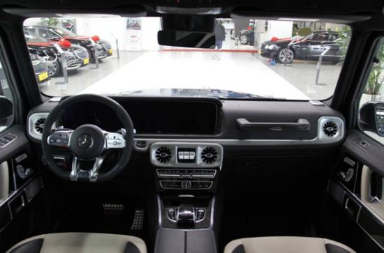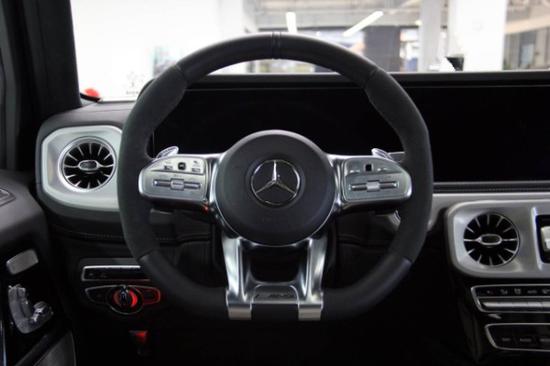 2020款全新奔驰G63内饰方面,保留了新G500 (配置|询价)的整体设计,除配色差异外,新车还换装了全新造型的平底式AMG运动方向盘,其两侧配以打孔皮质包裹,下部镀铬装饰的造型也与新G500明显不同,看上去十分战斗。