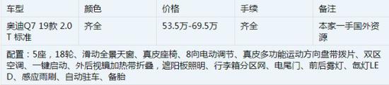 20款奥迪Q7细节上也发生了巨大的改动,简练的中控台选用铝制和木质饰板相调配,愈加突显新车的奢华感与科技感。奥迪Q7的内饰造型是典型 奥迪风格,原料高级、做工精密,真皮座椅、前排中心扶手也由分体变成了全体扶手。多功用方向盘在中心区块选用更多圆形线条规划,全体看起来更细巧,手感也愈加。奥迪(平行进口) 长*宽*高:5052*1968*1740MM 车身布局:5门7座SUV 最高车速:209KM/H 百公里加快:5.7KM/H 轴距:2994MM 最大载重质量:740KG 油箱容积:85L 行李厢容积:515L 排量:2995ML 进气形式:机械增压气缸摆列形式:V6 最大马力:338PS 最大功率:248KW 最大扭矩:597N.M 变速箱:8挡手自一体主动变速。