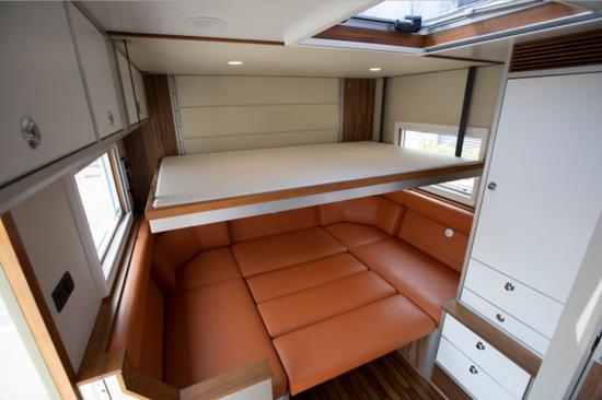 需要时可变为一张2000mm×1450mm沙发床,而且在沙发区顶部还有一张隐藏式电动升降床2000mm×1200mm,两张床可以满足4人入住。
