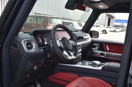 奔驰G63保留了新G500的整体设计,除配色差异外,新车还换装了全新造型的平底式AMG运动方向盘,其两侧配以打孔皮质包裹,下部镀铬装饰的造型也与新G 500明显不同,看上去十分战斗。此外,全液晶仪表盘+中控大屏的双12.3英寸屏幕设计在新车上也没有缺席,营造出了浓郁的科技感。
