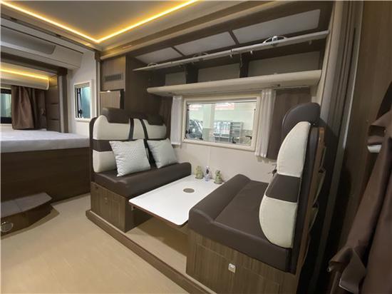 我们首先说说这依维柯房车的会客区域,两张沙发座椅,柔软舒适,一张可升降的会客桌,让会客区域的功能性大大增加,既可以是会客用,也能是孩童娱乐用的一篇小天地。