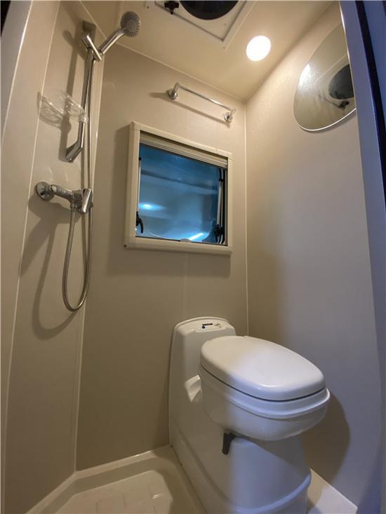 旅居房车的灵魂,就是这个卫生间了,淋浴花洒和车载式抽水马桶一应俱全,就算是在堵在路上都一样游刃有余。