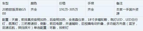 20款奔驰G500欧版 时光铭刻版 黑/黑 国六排放标准 现车包包税 随时过户 配置:天窗、宽屏、暗夜包、菱形格座椅(通风按摩)、柏林之声音响、雷测、隐私玻璃、64色氛围灯、多束灯LED大灯、AMG包、停车辅助包(环影)、鹿皮顶、后娱预留、前加热风挡玻璃、100L大油箱、20吋亮黑轮、后仓隔板。详情如下表:
