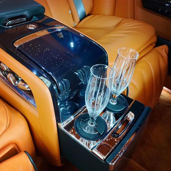 劳斯莱斯全新幻影电动折叠板和后排影院系统被巧妙的隐藏在前排座椅的椅背后,只需轻触按钮,便可以自如收放桌板和影院系统,带来完美的剧院体验。后排中央固定扶手做了重点优化,其中国可容纳带有威士忌酒具的酒柜、香槟酒具和冷藏箱,方便乘客畅快交谈,后排座椅角度可以任意调节,这一设计让客户无需转头便可视线自如交流。举世闻名的星光饰顶抬头可见,整个车厢内饰全部以最精美的高档材料装饰,使车内极具触感。