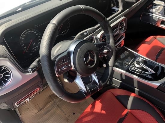全新G63内饰方面,新G63保留了新G500的整体设计,除配色差异外,新车还换装了全新造型的平底式AMG运动方向盘,其两侧配以打孔皮质包裹,下部镀铬装饰的造型也与新G 500明显不同,看上去十分战斗。此外,全液晶仪表盘+中控大屏的双12.3英寸屏幕设计在新车上也没有缺席,营造出了浓郁的科技感。(详情请咨询文章末端经销商)
