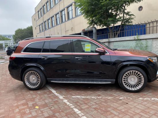 车身侧面,非常巨大的轮毂,现在是标配21寸的轮毂,选装22.23寸的轮毂,也是目前奔驰能够选装最大尺寸的轮毂。这台车的尺寸跟GLS一样,然后车长超过五米二,整个轴距是超过三米一。然后侧面还有电动伸缩的踏板,当你打开这个车门的时候直接会弹出来,整个车空气悬挂会下降,然后你就可以非常方便的上下车,D柱我们看到有迈巴赫的标志。