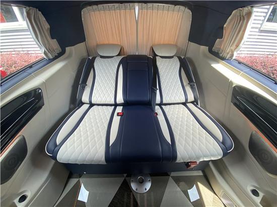 后排三座座椅更像是一个多人沙发了,座椅可以通过触摸屏控制直接展开成床,无论是短时间的休息还是孩童的玩耍都是不可多得的场所。