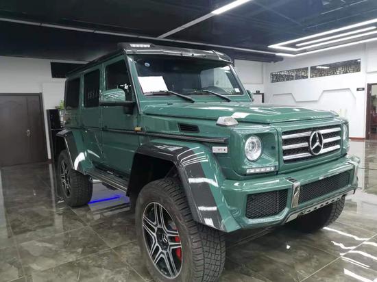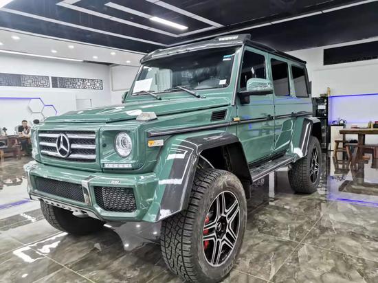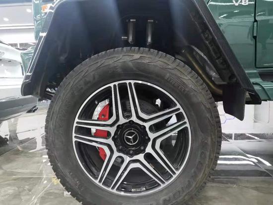 17款奔驰G550 4x4采用与G级 (配置|询价)AMG车型采用了相同的设计,保险杠下部增加了镀铬下护板,车顶增加了可拆卸的碳纤维扰流板,扰 流板两侧融入了LED灯光系统。新车轮距进行加宽 四轮独立悬挂双避震器,对比普通版整大了一圈,也增加了最高通过性和涉水能力。