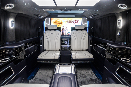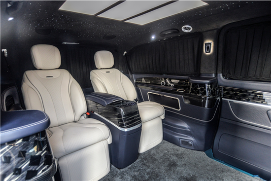 奔驰V260L隐藏六座系列后排座椅为总裁沙发座椅(根据人体工程学设计)一键式展开一键收回(记忆功能)自动找到最舒适的角度,舒适度和随意性更强,双侧壁设计集成丰富配置,多媒体触摸屏、商务桌板、多媒体接口、压缩机车载冰箱等办公、娱乐设备给您带来充足乘坐享受,精湛工艺可靠品质树立威霆商务房车新典范。