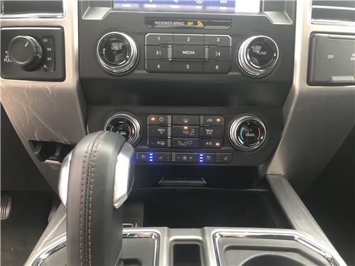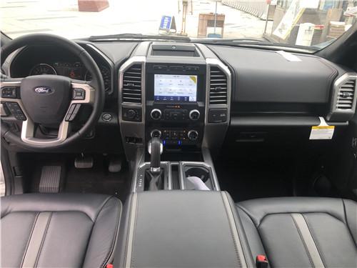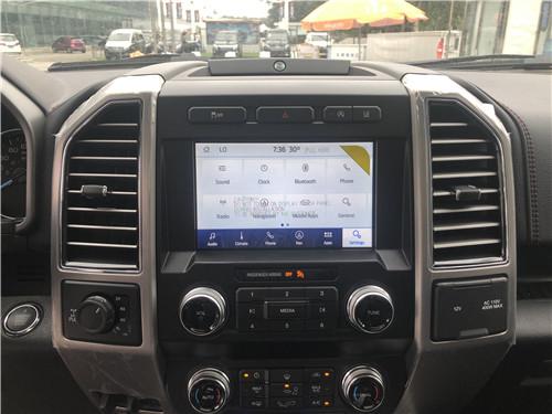 进入内饰最明显的是拉丝铝装饰的大方向盘,并且多了记忆、加热和调节功能;白金版F150选用双区自动空调,出风口上还多了镀铬装饰;适中的8寸液晶显示屏提升了一丝科教感。