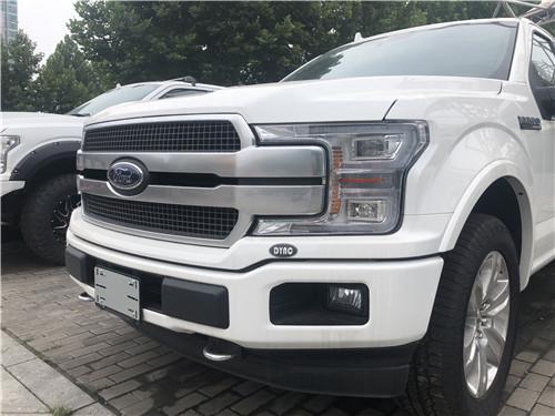 2020款福特F150白金版前脸有银色中网,保险杠有镀铬装饰,前大灯采用LED光源并加有透镜,引擎盖上的两条直线勾勒出美式车辆的肌肉感辨识度很高。