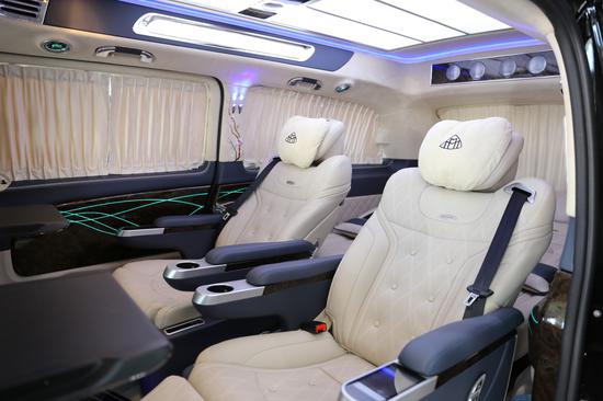 奔驰VS900迈巴赫商务车升级款迈巴赫VS980L选择定制升级7座商务车,无疑不是被它更为个性化的定制风格和与原车相比更为舒适的配置所吸引。我们进入驾驶舱是就感受到了这样豪华氛围,真皮的材质,菱形的缝线,真皮打孔方向盘握感相当舒适。Nappa真皮多功能方向盘,支持多角度调节,操纵杆流畅舒适更安全;典雅复古风岑木中控面板,纹路清晰可见,手感细滑自然。