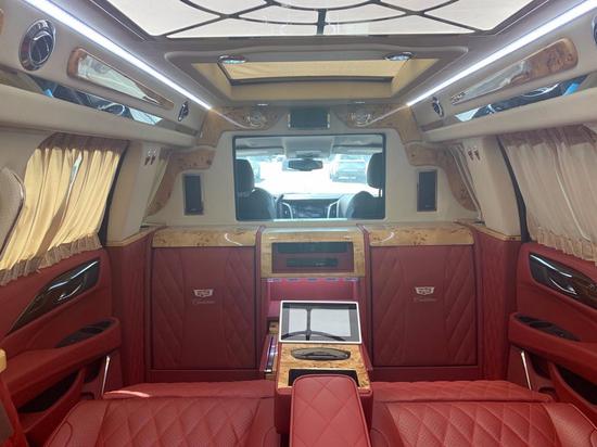 四座凯雷德总统一号升降一体化的40寸液晶电视,还可以联接网络,车内配备有4G无线WIFI路由器,购车后你可以处理一张流量卡,你的车子就会有WIFI网络,就像家里相同,手机也可以用,非常便当,有的老板喜欢看新闻,这样便于老板出差也能随时收看到新闻频道。