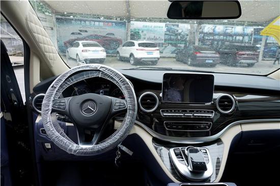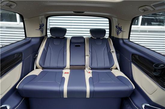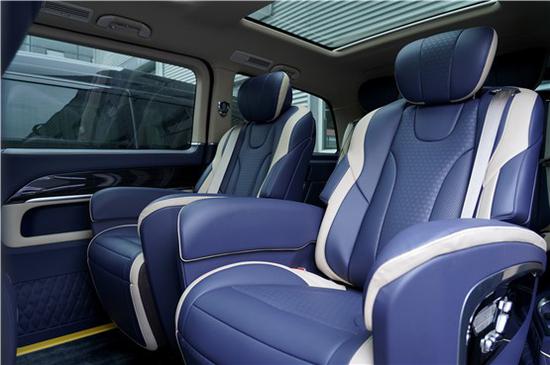 就如这台奔驰V级就是做了内饰的升级定制,从驾驶室就能看出,和奔驰V级原型车有着很大的区别,三幅式运动方向盘,钢琴镜面烤漆的中控饰板,蓝白两色的真皮包覆,高级感就在这些细节处体现。