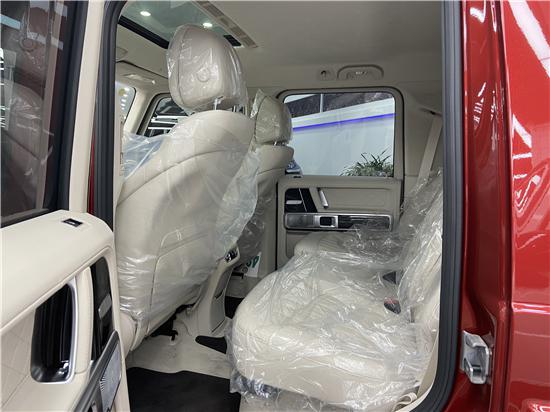 20款奔驰G63的座椅除了各种电动调节功能外,还带有腰托、腿托以及加热、通风、记忆功能。座椅还是很厚实,都是真皮材质,有菱格纹的走线,红黑配色的座椅也是这台车的特色所在。