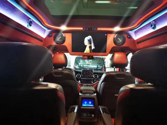 进入后舱这款奔驰V250采用的是前后排隔断的处理方式,更好的为大家提供隐秘性并且大大提升了后排的娱乐体验。隔断采用的是32寸曲面屏电视后排的乘客可以通过隔断下方的中央操控面板控制的电视升降和车内灯光的调节。如果需要跟前排的驾驶员沟通您可以把隔断放下跟驾驶员有更好的沟通环境,包括隔断下方的镀装饰大大的提升了车内的豪华感。