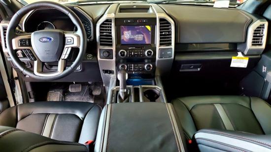 20款福特F150内饰采用独特的中控台和门饰板面漆和真皮包裹的方向盘。中控台部分辅以银色饰板装饰,六指针仪表盘的设计有些后工业时代的复古风格。采用带电冷热功能的可记忆式皮革座椅,头枕四向可调,搭配铝饰条和黑色钢琴烤漆内饰。可电动升降的后窗带隔板和电热除霜功能