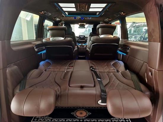 奔驰V250商务车乘客舱第二排多功能座椅,可旋转,并带有脚托功能,舒适乘坐,附有加热、通风、电动调节、腿托、按摩、记忆、电动头枕、电动靠背等功能,座椅支持180度旋转。三排座椅电动调节三连座设计配合旋转的二排座椅可以变成一张舒适的双人床,如果单独打开第三排座椅也可以变成一张供您休息的超大单人床。为您的长途行程提供充足的睡眠。