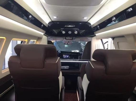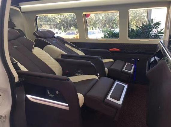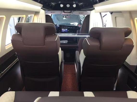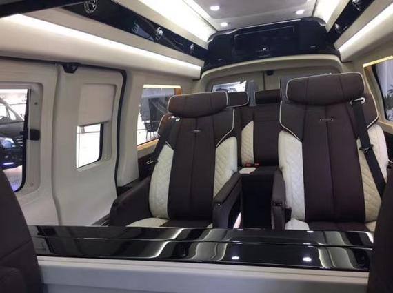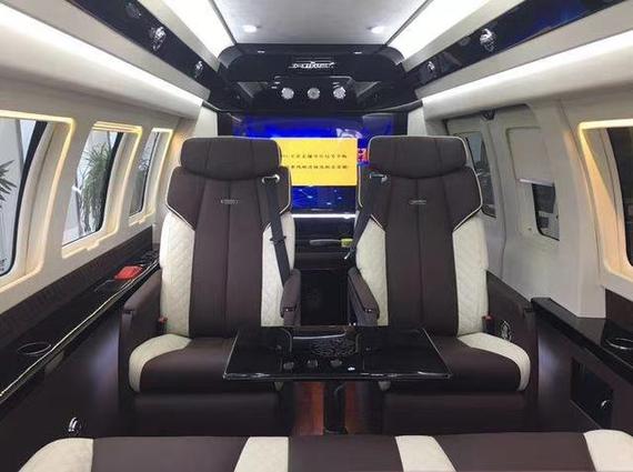 全车隐私隔热玻璃、前后独立空调、电动升降高清显示屏、前后对讲系统、美式真皮吊顶、车内氛围灯、真皮吧台酒柜、可拆卸会议桌、真皮桃木仪表盘、车载吸尘器、电动调节沙发床、沙发床中央扶手、中部八向电动按摩加热座椅、真皮桃木多功能方向盘、大容量压缩机冰箱、后排娱乐系统、220V车载电源。
